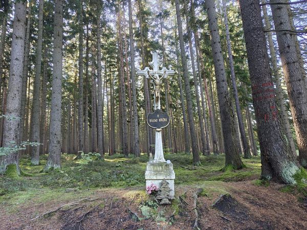 Od Brdlavky půjde vaše cesta dlouho do kopečka. Byť stoupání není náročné, je dlouhé. Projdete kolem pomníku věnovanému partyzánovi Romanu Rudnikovi, který na tomto místě zemřel v boji za svobodu 23. dubna 1945 a po zpevněné cestě půjdete dál až do míst, kde uhýbá doprava a rovně vede lesní cesta. Vy se dáte rovně, projdete kolem kazatelny a než se nadějete, cestu vám zkříží červené turistické značení, kde se dáte doleva a po pár krocích budete na Čtyřmezí.