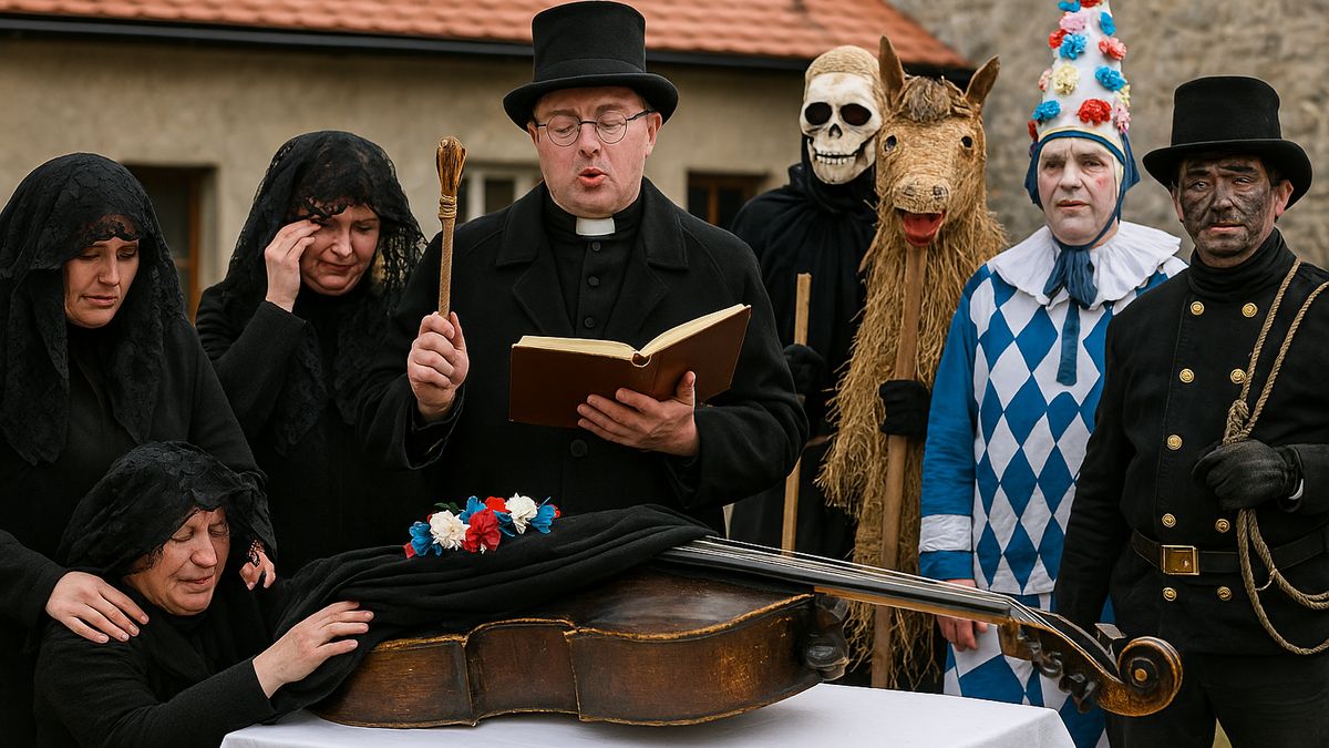 Scénka byla plná přehrávaného nářku, falešných modliteb, komických výčitek a narážek na události uplynulého roku. Basa byla oplakávána jako ta, která nás provázela celou zimu, jako věrná družka muzikantů nebo hříšnice, která sváděla k tanci.