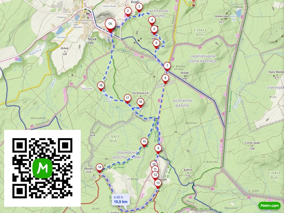 Pevně věříme, že se vám výlet bude líbit a oceníte i malá zastavení, která vám ukáží tu pravou krásu Brd. Trasa výletu je dlouhá bez zacházky na vrchol Jordán, která není v mapě zakreslena, 15,5 kilometru. Převýšení na trase je 375 metrů. Výlet byste měli stihnout absolvovat za necelých 5 hodin, ale pozor, to je čas bez přestávek, které na trase jistě oceníte. Protože je parkoviště v obci Dolní Kvaň malé, doporučujeme být tam co nejdříve. Alternativní parkování se nehledá úplně snadno, obzvlášť když je třeba myslet na to, že po lesních cestách jezdí vojenská a velká lesní technika.