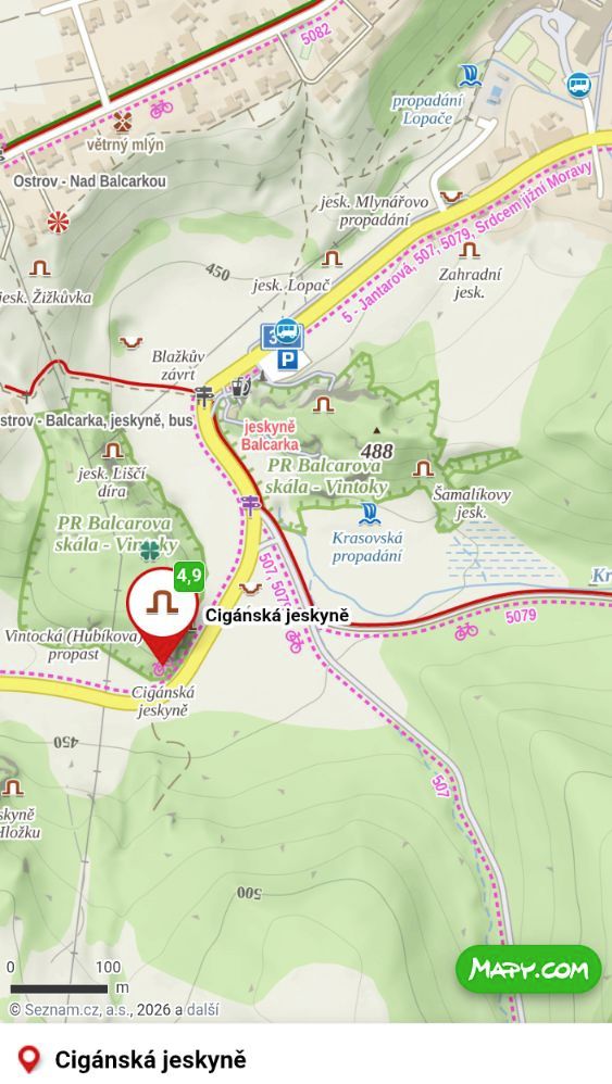 Od autobusové zastávky Ostrov u Macochy – Balcarka se vydejte směrem do Suchého žlebu a napojte se na cyklostezku č. 5079, která vede souběžně se silnicí 373.