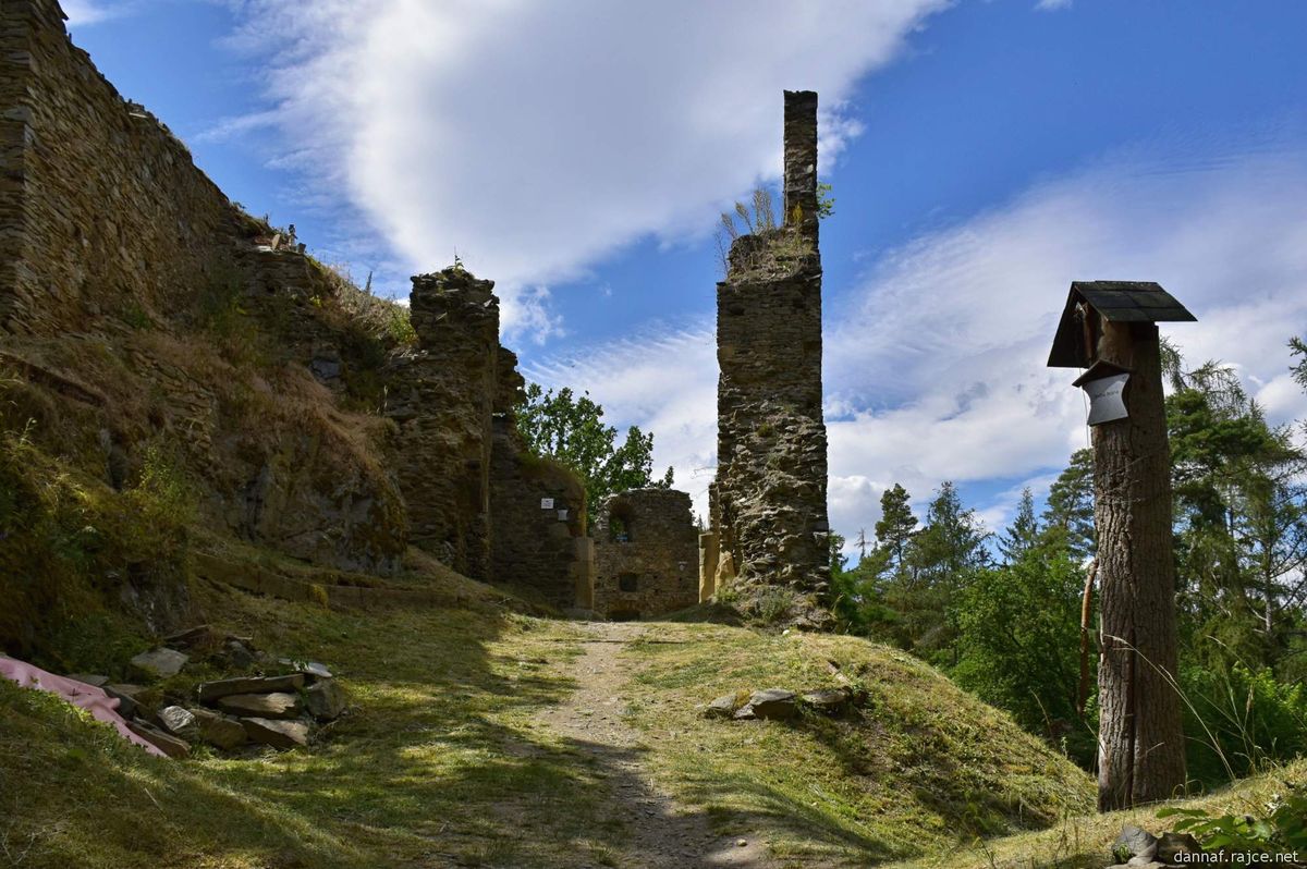 Po příchodu ke skalnatému ostrohu se objeví zbytky hradu Buben.
