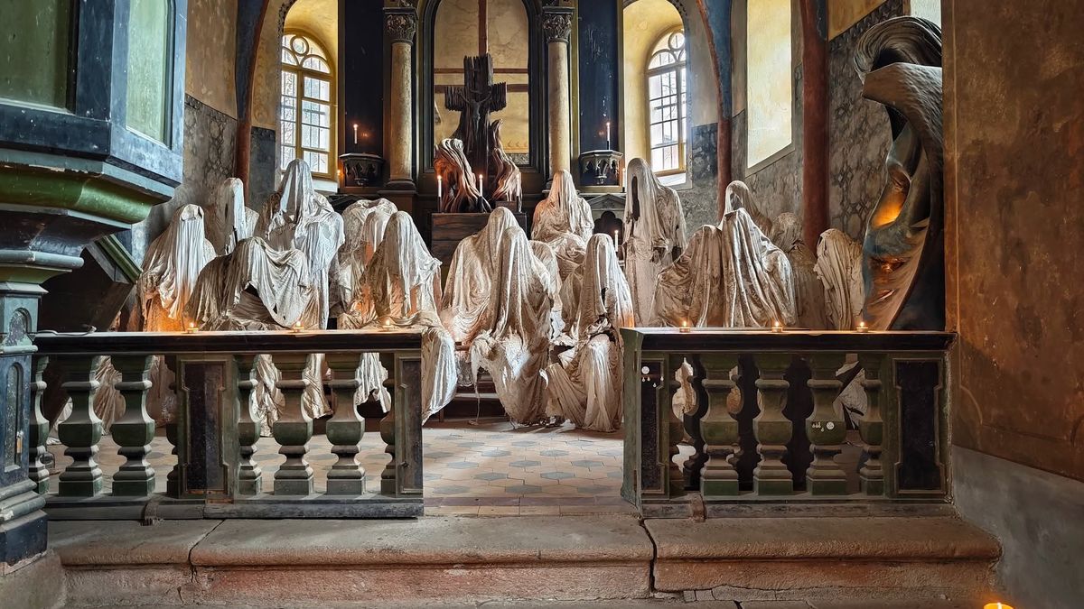 Uvnitř sedí lidé. Mlčky, bez hnutí. Desítky postav zahalených v bílých pláštích, s hlavami skloněnými, jako by se právě modlily. Když závane vzduch, látky se lehce zachvějí a člověku přeběhne mráz po zádech. Zdá se, že duchové dávných farníků se vrátili, aby dohlíželi na svůj kostel.