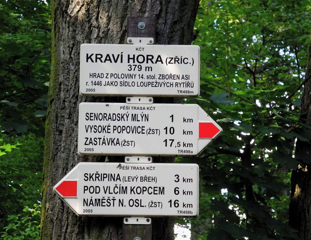 Na mapě vypadá Kraví hora nenápadně. Malý nápis, několik těsně semknutých vrstevnic a modrá čára řeky, která se klikatí bez ambicí být přímá. Žádná rozhledna, žádné parkoviště, žádný symbol, který by naznačoval „zastav se tady“. A přesto jde o jedno z míst, kam se lidé vracejí opakovaně. Ne proto, že by nabízelo víc než okolí, ale proto, že tu nic nepřebývá.