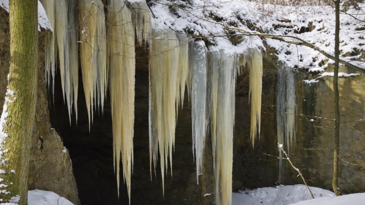 Jiný charakter mají ledové útvary v oblastech s výrazným sopečným podložím, například v okolí Polevska a Prysku. Čedič zde vytváří strmé stěny, po nichž voda stéká v tenkých proudech. V mrazech se tyto proudy mění v ledové záclony, průsvitné a místy namodralé. Led tu není hladký, ale strukturovaný, vrstvený, jako by vyprávěl příběh o každém dni mrazu a každé noci, kdy teplota ještě o něco klesla. Když se člověk zastaví a dívá se zblízka, uvidí drobné bublinky uvězněné v ledu, zkamenělé stopy pohybu vody, která se v jednu chvíli zastavila.