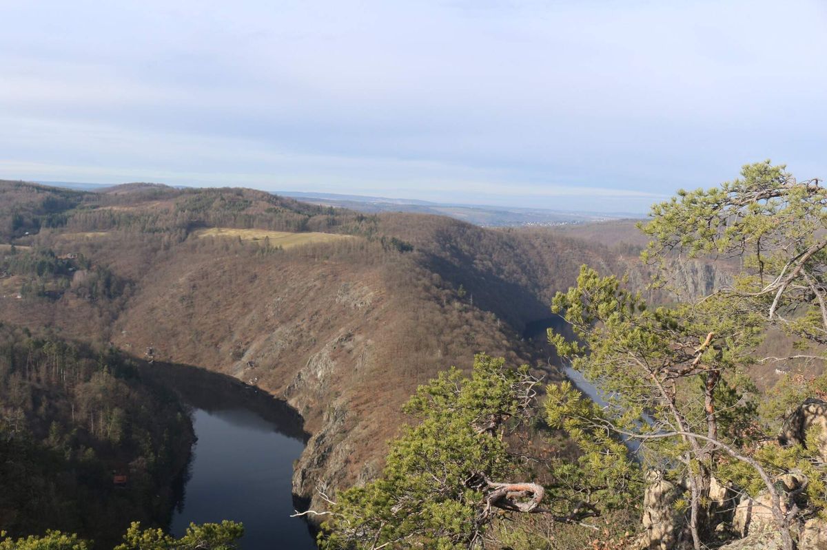 Dole hluboko pod námi se v širokém oblouku stáčela Vltava. Řeka zde vytváří jeden z nejznámějších meandrů v České republice. Lesy na svazích byly ještě místy hnědé po zimě, ale mezi nimi už začínaly svítit první zelené stromy.