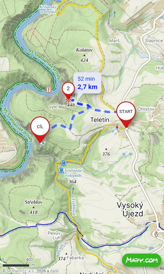Odtud projděte obcí směrem k okraji lesa, kde asfaltová cesta brzy přechází v lesní cestu vedoucí k hřebeni nad řekou. Asi po 1,1 kilometru chůze dorazíte na známou vyhlídku Máj, odkud se otevírá jeden z nejkrásnějších pohledů na meandr Vltavy.