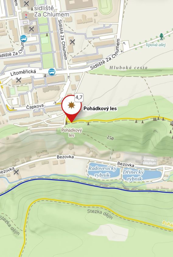 Jedním z nejpohodlnějších výchozích bodů je ulice Čapkova u sídliště Za Chlumem. Právě odsud vede krátká a nenáročná cesta přímo do Pohádkového lesa. Stačí sejít směrem k lesu a napojit se na místní stezky. Lokalita je dobře dostupná pěšky a okolí obvykle umožňuje i zaparkování. Terén je vhodný pro rodiny s dětmi i pro nenáročnou procházku.