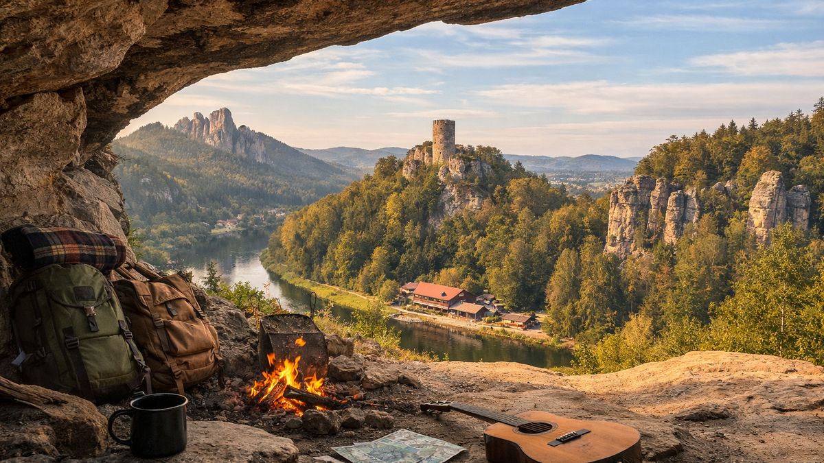 Večer přichází pomalu. Oheň děláme malý, skoro stydlivý. Tony vytáhne kytaru a začne schválně hrát blbiny, aby nikdo nebyl příliš vážný. Eliška se směje tak, že to musí slyšet i skály nahoře. Barča vaří čaj a já si uvědomuju, že přesně pro tyhle chvíle se chodí. Když se setmí, les začne mluvit, ne strašidelně, spíš po svém. Prasknutí, šustnutí, ticho, které není prázdné. Brouček drží. Noc je klidná, ale cítíš, že se vandr teprve rozjíždí.