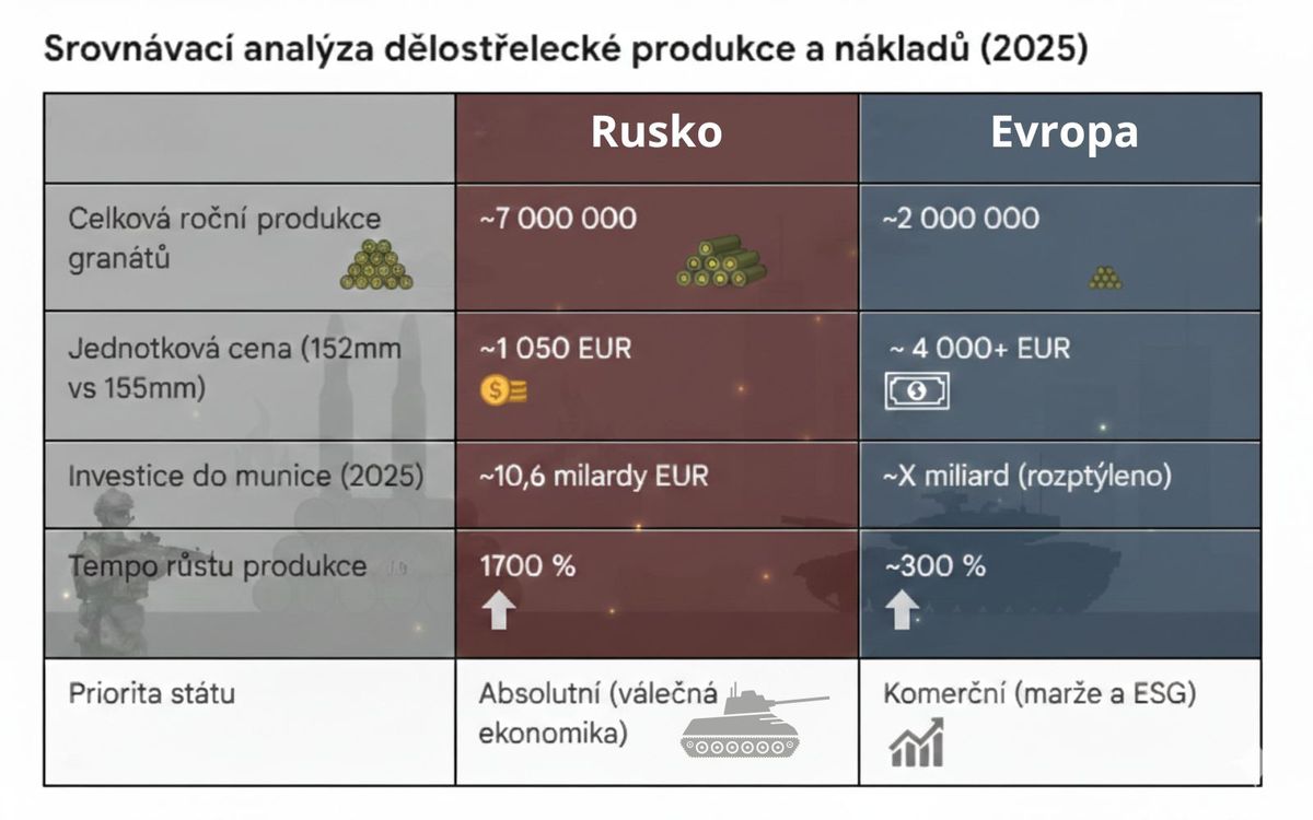 Tato ruská odhodlanost je poháněna paranoiou z evropského přezbrojení. Kreml vidí, že se Evropa (byť pomalu) probouzí, a proto se snaží vytvořit si masivní náskok v zásobách munice a techniky. Je to závod v čase. Rusko sází na svou „smrtící efektivitu“ a schopnost trpět, zatímco Evropa doufá, že její „marže“ a ekonomická síla budou stačit k odstrašení bez nutnosti reálné oběti.