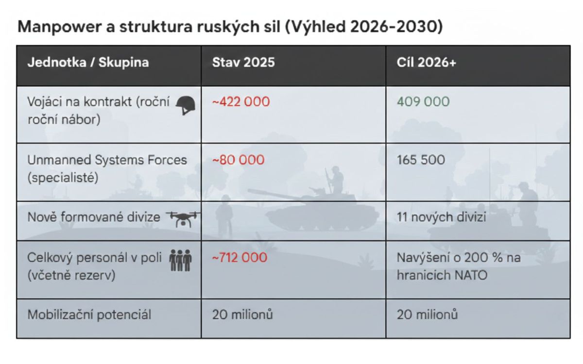 Cíle pro rok 2026 jsou jasné: úplná okupace Donbasu a Záporožské oblasti na Ukrajině, ale paralelně s tím příprava na „fait accompli“ v Pobaltí. Strategie počítá s tím, že Rusko dokáže zmobilizovat své síly rychleji než NATO dokáže dosáhnout politického konsenzu. Pomocí neoznačených jednotek a dronů mohou obsadit symbolicky významná území (jako je Narva) dříve, než se první americký voják probudí v kasárnách v Německu.