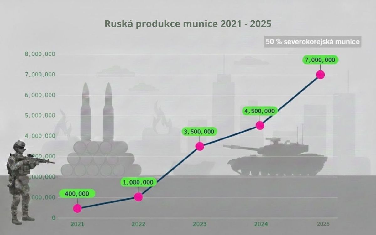 V roce 2025 utratilo Rusko za nákup munice přibližně 1 bilion rublů (10,6 miliardy eur). To je částka, která by v evropském kontextu stačila sotva na zlomek stejného objemu. Ruské finance jsou napnuté k prasknutí, ale válečný stroj má prioritu před vším ostatním. Rozpočet na rok 2026 počítá s dalším osekáním civilních výdajů.