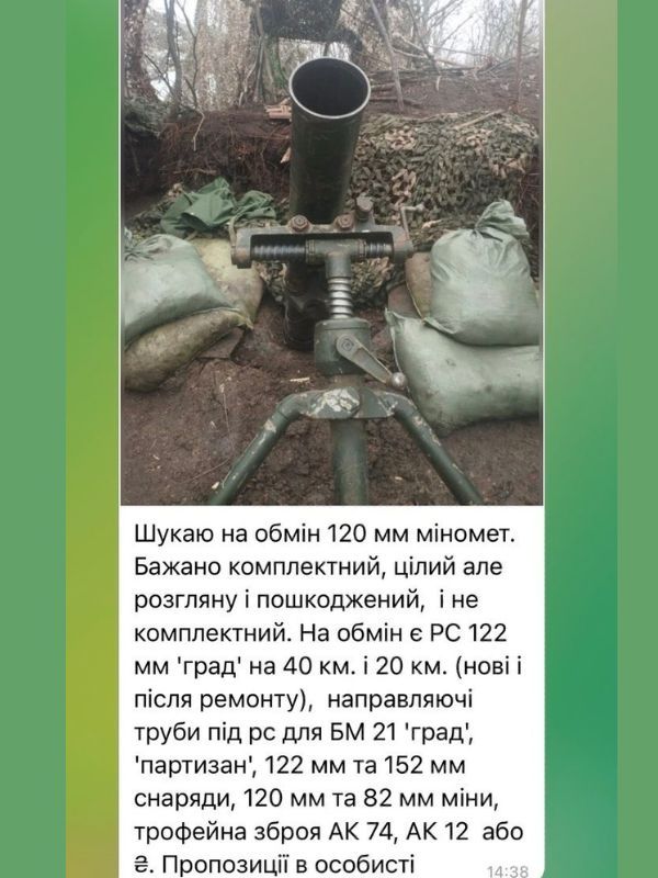 Na výměnu mám RS 122 mm ‚Grad‘ na 40 km i 20 km…“ Tady vidíte chaos v přímém přenosu. Jednotka má rakety do raketometu Grad, ale nemá raketomet. Zato nutně potřebuje funkční minomet. Jsou to desítky inzerátů každý den, které rozhodují o tom, zda na konkrétním úseku fronty bude zítra čím střílet. Že bude čím zaletět a dovézt jídlo nebo náboje do nejpřednějších pozic.
