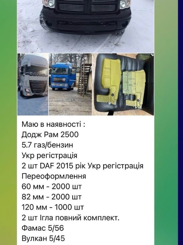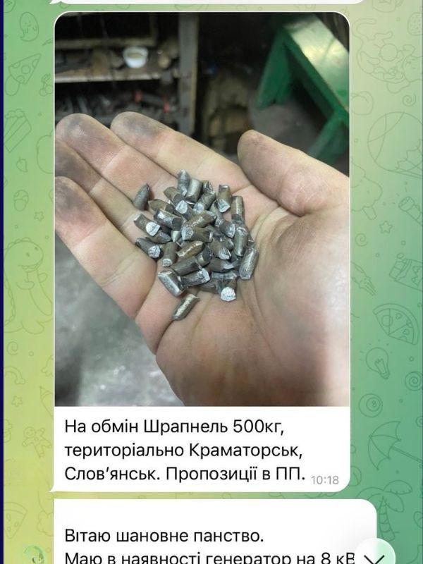 Skutečnou surovost a odhodlání účastníků tohoto směnného obchodu odhaluje fotka špinavé ruky, která drží hrst nasekaných ocelových válečků. „Na výměnu šrapnel 500 kg… Kramatorsk, Slavjansk.“ .