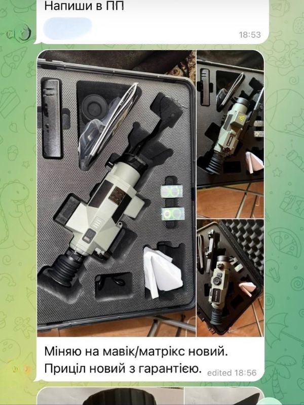 Otevřený kufr, v něm špičkový termovizní zaměřovač. Vypadá úplně nový. Text pod tím je stručný: „Měním za nový Mavic/Matrice. Zaměřovač je nový se zárukou.“