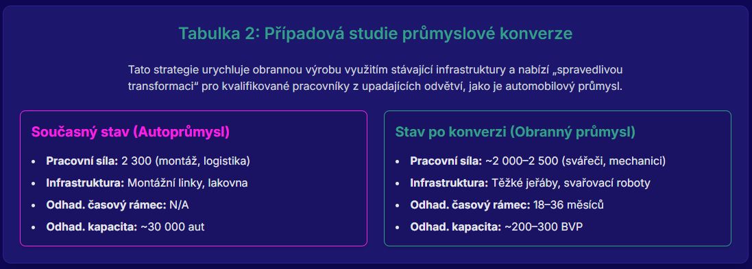 Největší výzvou je však rychlost. Mnohem efektivnější než stavět nové továrny je konverze stávajících civilních průmyslových kapacit. To nabízí jedinečnou synergii, zejména ve světle strukturálních problémů, kterým čelí evropský automobilový průmysl.