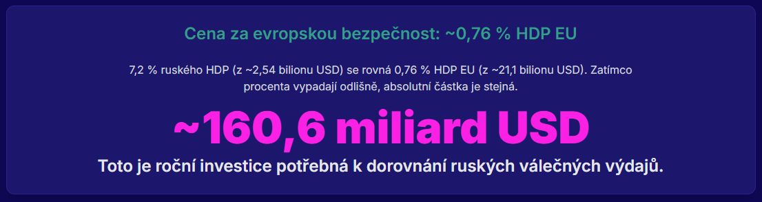 A kolik by stálo Evropu tuto částku dorovnat? Výpočet ukazuje, že k vyrovnání ruských válečných výdajů by EU potřebovala investovat přibližně 0.76 % svého HDP.