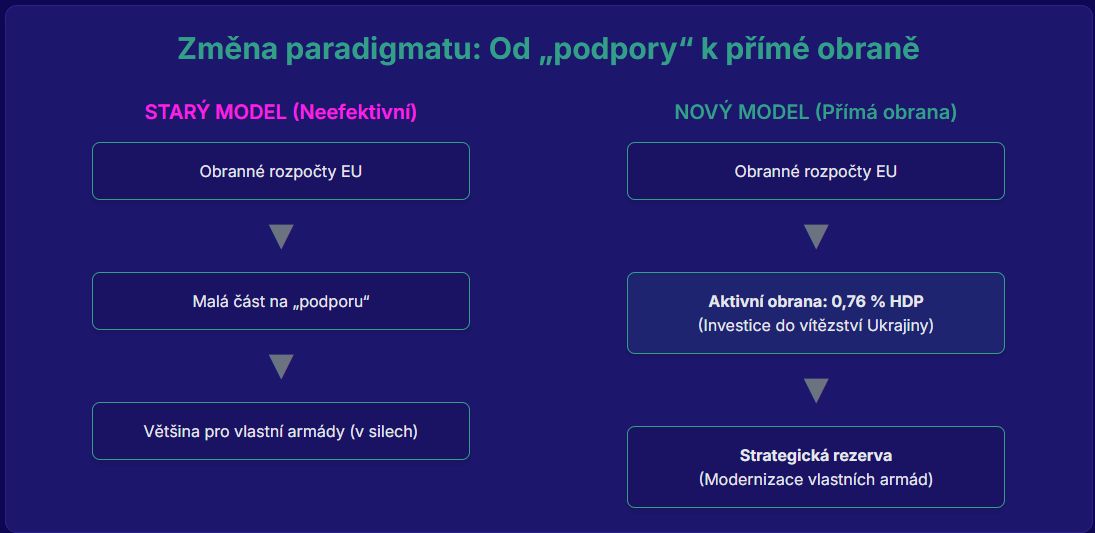 Dosažení tohoto obecného cíle je pro mnohé země dlouhodobou výzvou. Navrhovaná investice ve výši ~0.8 % HDP však není náklad navíc, ale „strategická realokace v rámci rostoucích obranných rozpočtů“. Nabízí mnohem konkrétnější a okamžitou cestu k bezpečnosti tím, že alokuje relativně malou část již schválených navýšených rozpočtů přímo na eliminaci největší a nejnaléhavější hrozby.