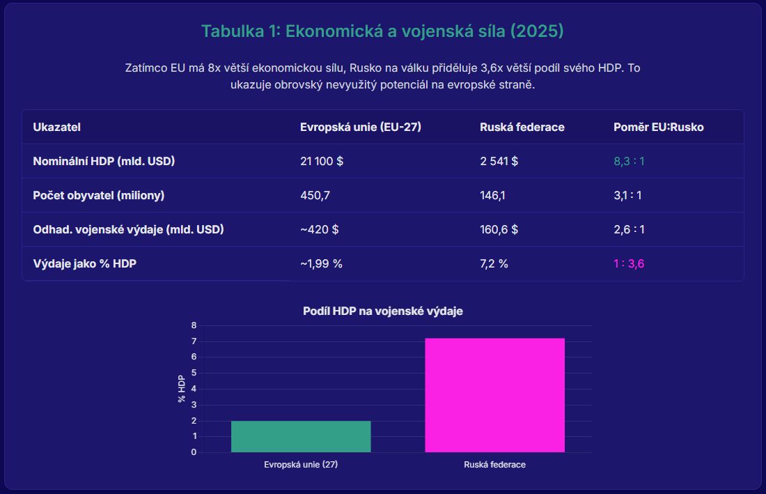 Srovnání makroekonomických ukazatelů odhaluje propastný rozdíl. Pro rok 2025 je nominální HDP Evropské unie projektováno na přibližně 21.1 bilionu USD, zatímco HDP Ruské federace je odhadováno na 2.54 bilionu USD. To představuje ohromující ekonomickou nerovnováhu v poměru přibližně 8,3:1 ve prospěch EU. Problémem tak není nedostatek zdrojů, ale deficit politické vůle a efektivní koordinace k jejich mobilizaci.