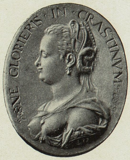 Pamětní mince s fiktivní podobiznou Kateřiny Stradové vydaná k výstavě k 300. výročí smrti Rudolfa II. v roce 1912. Pravou podobu hraběnky ale neznáme.