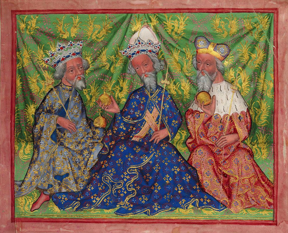 Karel IV. (uprostřed), Václav IV.(vlevo), Jošt (vpravo)