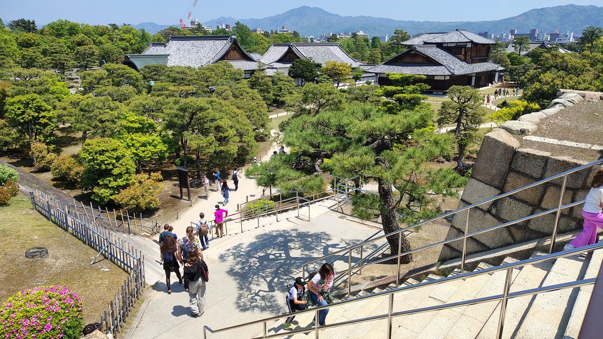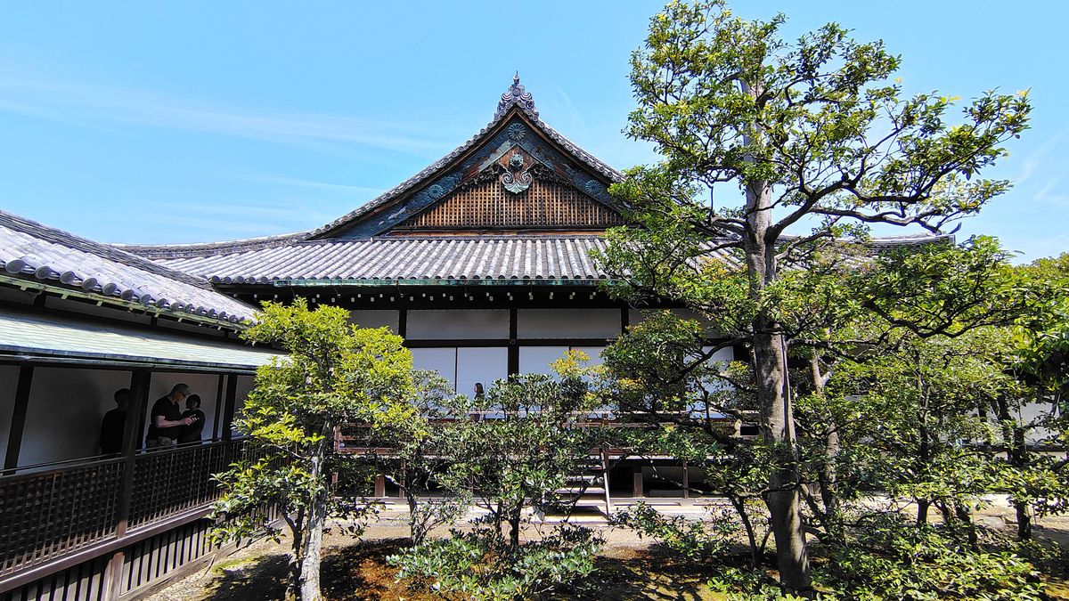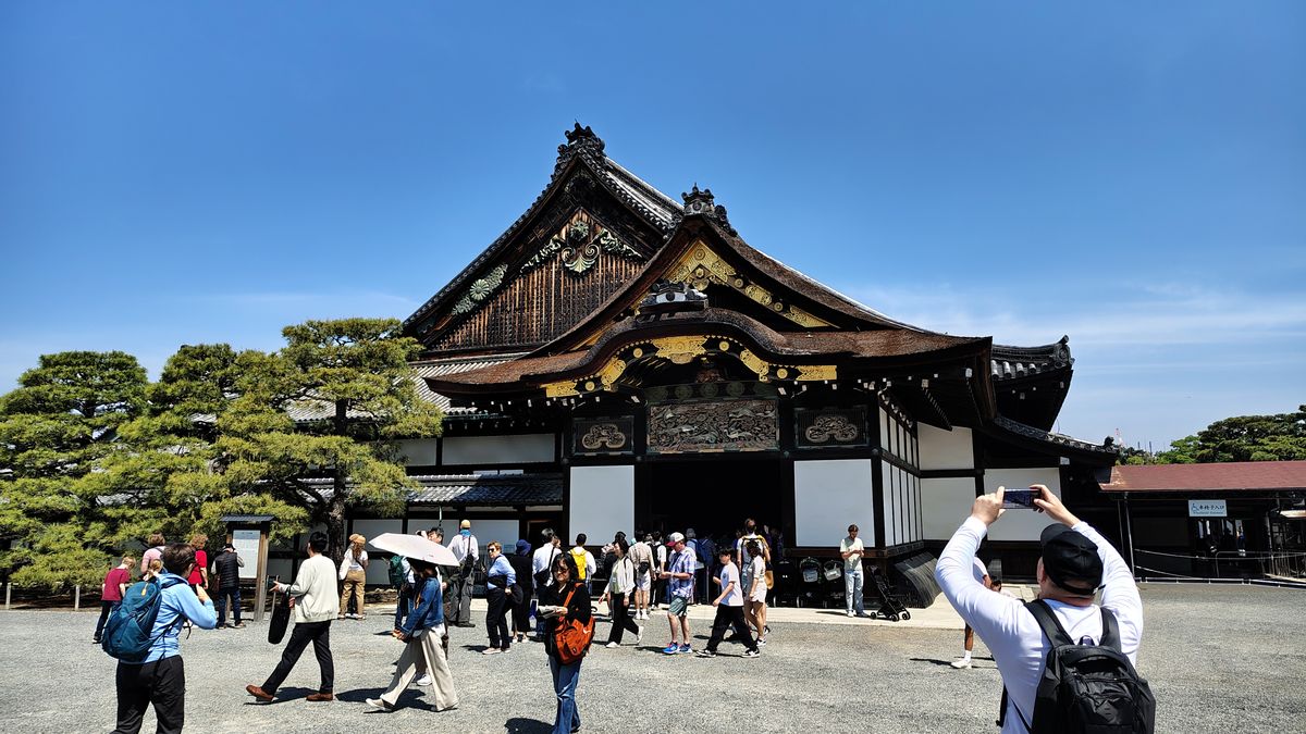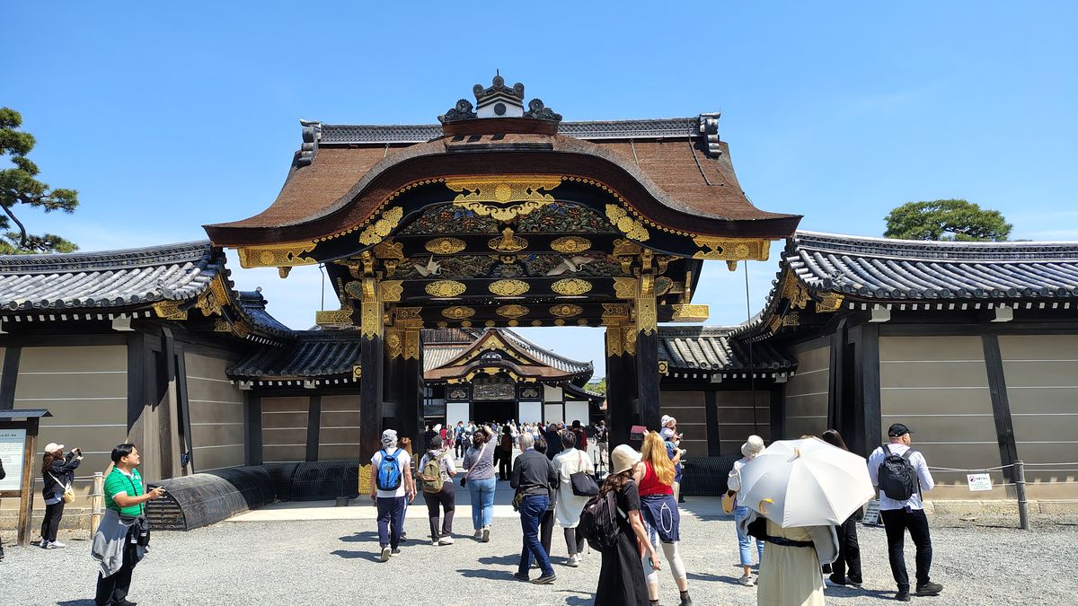 Už samotný vstup návštěvníky ohromí. Přes překrásnou bránu Karamon, vyřezávanou do detailů a zdobenou zlatem, se vstupuje do dvou hlavních obranných prstenců obklopených příkopem. Uvnitř se nachází několik palácových komplexů, mezi nimi ten nejdůležitější – palác Ninomaru. Právě zde šógun přijímal návštěvy a předváděl své bohatství i moc. Okolo paláce se rozprostírají nádherné zahrady, které mění atmosféru podle ročního období. Je zde i vyhlídka s panoramatem 360°, a pokud chcete, můžete si koupit krmení pro koi kapry za 400 jenů (asi 65,- Kč).