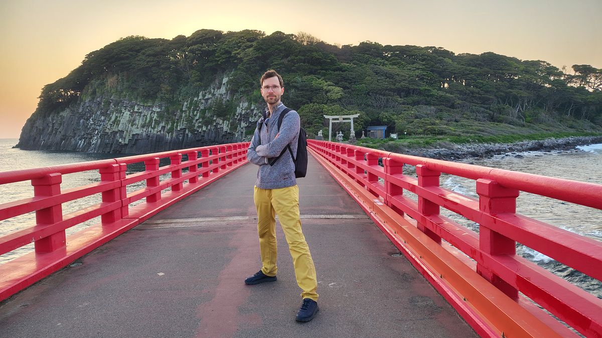 Můj hlavní cíl byl stihnout most a ideálně i západ slunce. Místní pán mi předtím doporučil ještě jednu vyhlídku, ale ta zavírala brzy a už se nám ji bohužel nepodařilo dohnat. Nevadí – i bez ní byla cesta směrem k ostrovu zážitek sám o sobě. Na konci chodníku se najednou objeví velká brána torii a ta okamžitě dává najevo, že dál vstupujete na území božstva. Ačkoliv se na Ošimě pohybují lidé, není jich mnoho. Spíš máte pocit, že jste tam jen vy, burácející moře, vítr a staré příběhy ostrova.