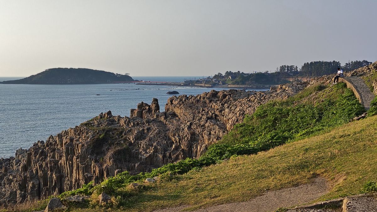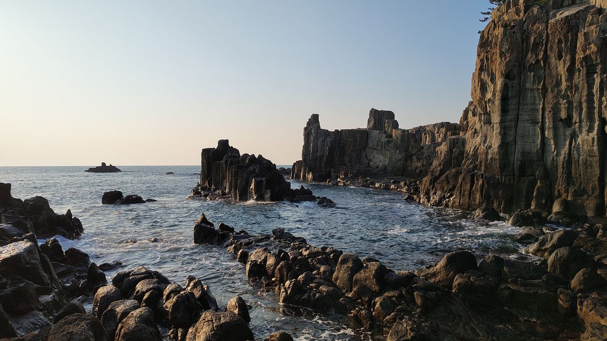 Moře kolem Ošimy má svou nezaměnitelnou atmosféru, voda není hluboká a přímo pod hladinou jsou vidět kameny, které během odlivu úplně změní barvu – krásně ukazují, jak moc se hladina zvedá a klesá. Do toho přichází silné, krásné vlny, které se tříští o útesy. V jednu chvíli jsem na levé straně zahlédl siluetu muže, pravděpodobně rybáře, který tam stál skoro jako součást krajiny. Bylo zajímavé sledovat i útesy Tojinbo z opačné strany ostrova – vypadají ještě dramatičtěji než z vyhlídek na pevnině.