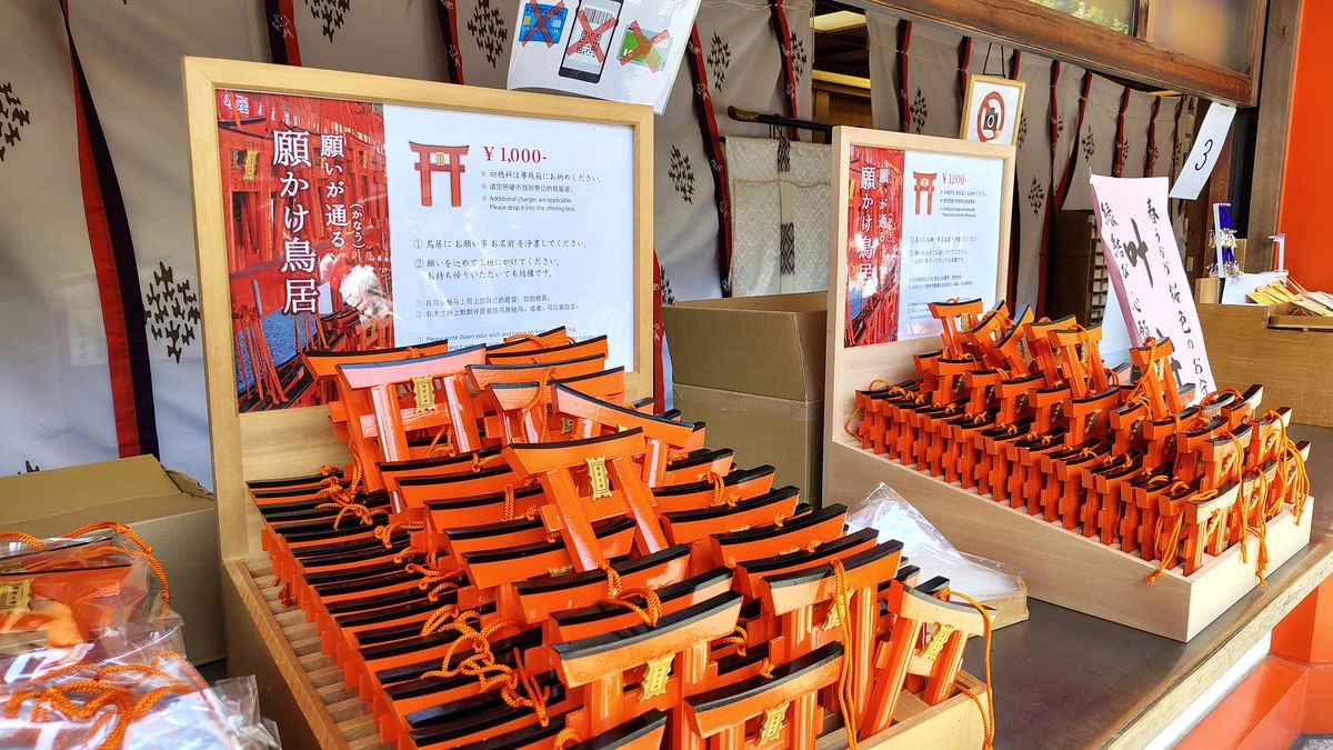 Dole u svatyně si můžete koupit i onu oranžovou bránu v mnoha velikostech, napíšete na ni své jméno a přání, pověsíte ji na určené místo a kněží ji později rituálně odevzdají božstvu. Staré brány se nakonec spalují při obřadech, aby přání mohly symbolicky odejít do světa kami.