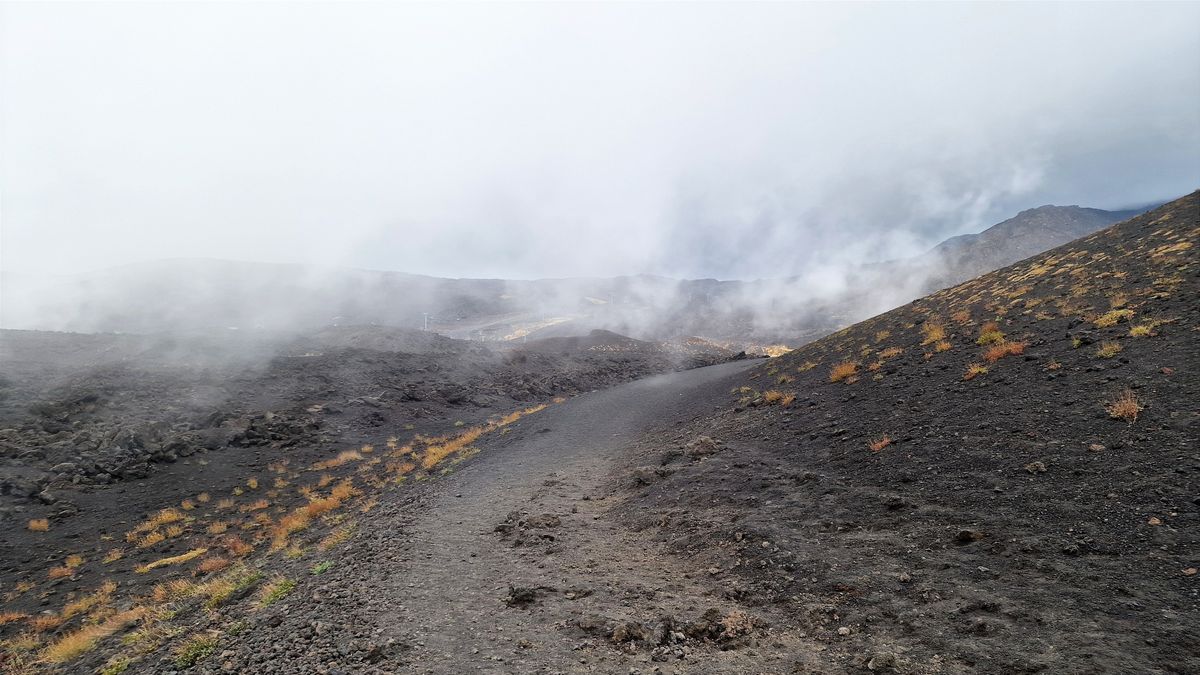 Pohled na úbočí Etny zahalené do mraků. Katánie, Sicílie.