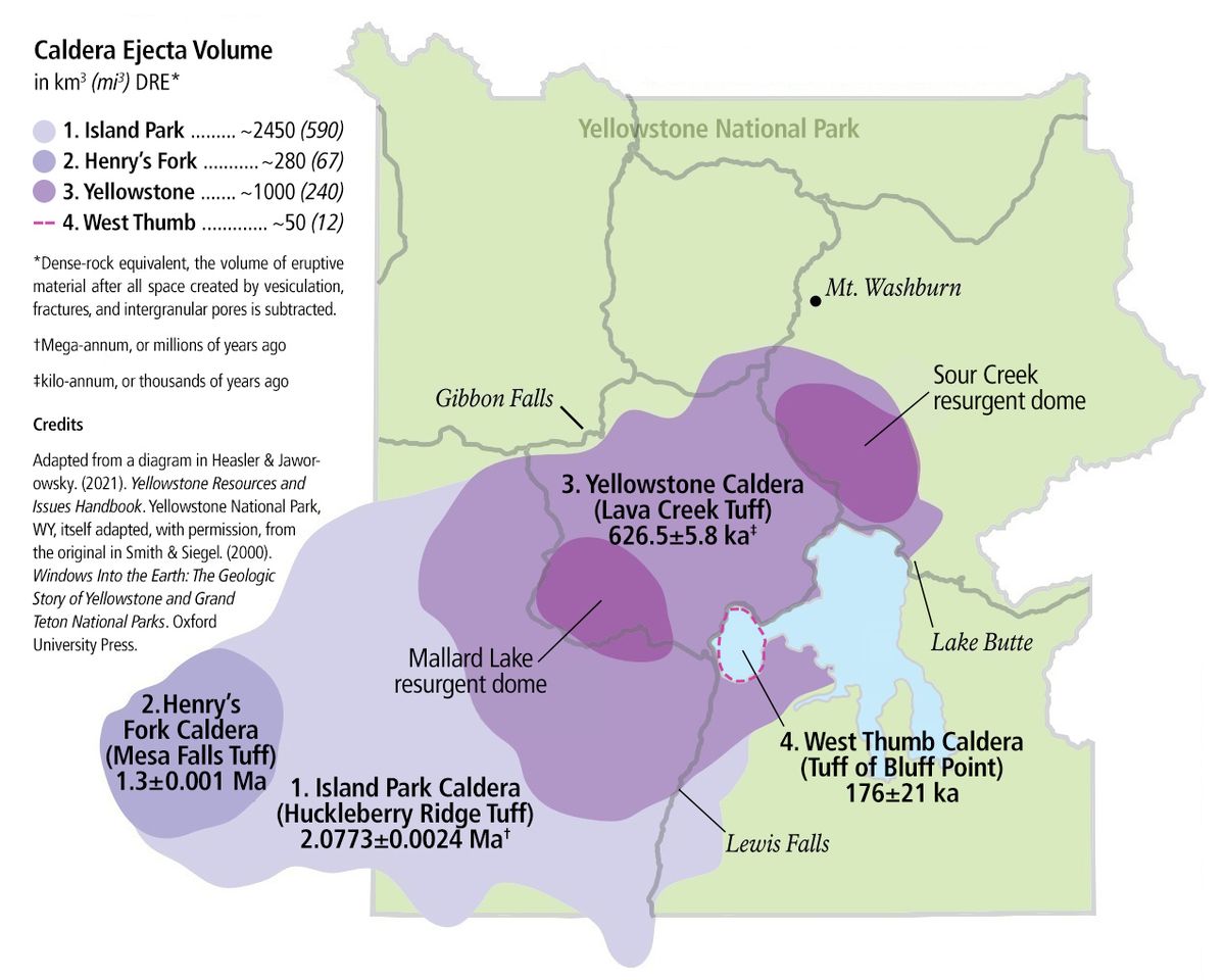 To znamená, že když Yellowstone v průběhu milionů let „vybuchoval“, tak se velké výbuchy nevyskytovaly pořád na stejném místě. Staré kaldery zůstávají jako jizvy v krajině a nové erupce se objevují o něco dál.