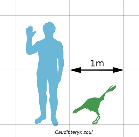 Někomu by se při pohledu na úvodní obrázek mohl vybavit Velociraptor. A nebyl by daleko od pravdy. V obou případech se jednalo o dva teropodní dinosaury s malým, opeřeným tělem, s nijak závratnou váhou, dlouhými končetinami a ocasem. Rozdíl byl ve specializaci každého z nich, zatímco Velociraptor byl predátorem, který má v hledáčku obratlovce a mláďata jiných dinosaurů, Caudipteryx měl úplně jiný jídelníček. Kromě toho měl Caudipterys symetrická pera a krátké horní končetiny, kdežto Velociraptor měl delší končetiny a asymetrická pera.