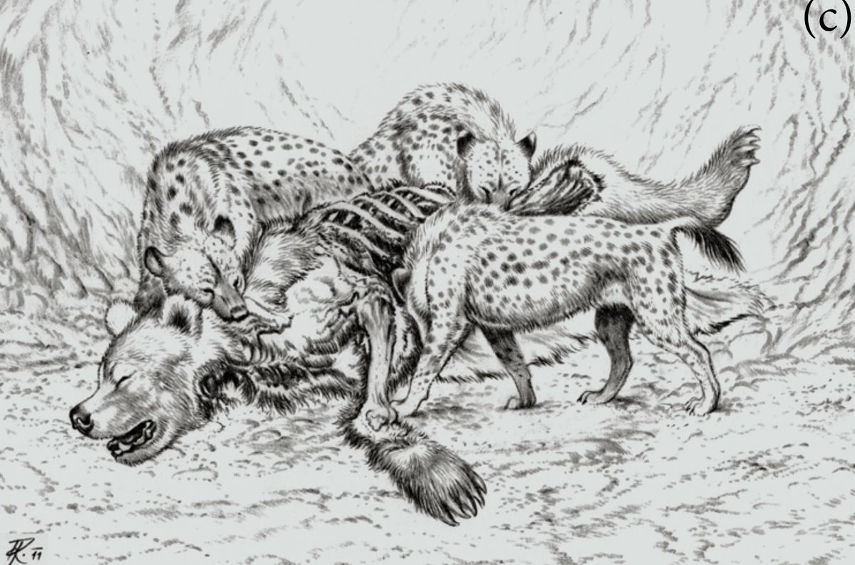 Ilustrace hyen živících se na zdechlině pravěkého medvěda