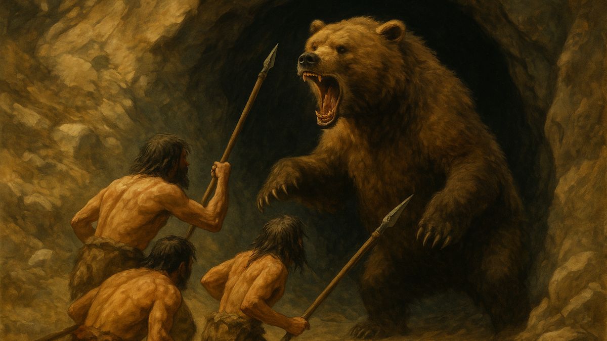 Neandertálci i raní Homo sapiens narazili na medvědy jeskynní v jejich vlastním světě. V některých jeskyních se vrstvy ohnišť střídají s vrstvami medvědích kostí. Někde jsou lebky položené na kamenech, jinde kosti přerovnané, jako by jim člověk dával rituální řád. V Chauvetově jeskyni jsou malby medvědů s takovou pozorností k detailu, že to nevypadá na ztvárnění legendy, ale na pozorování opravdu zblízka.