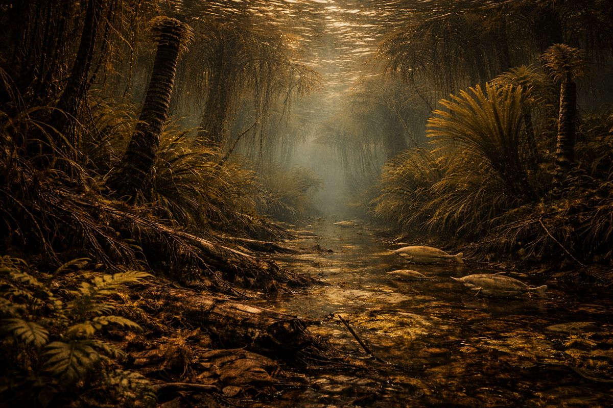 Dno karbonských řek bylo bahnité, poseté těly mrtvých ryb, nebo spíš jejich kostmi, rozkládajícími se rostlinami. Takový vodní hřbitov. Každý pohyb v řece znamenal rozvíření bahna, zakalení vody, a ještě větší tmu než ta, která byla před několika vteřinami. Ovšem nebylo to tak, že by se tady ryby jen tak nazdařbůh plavaly. Každá ryba se někde skrývala, naslouchala, zda někde poblíž neplave riziko, kvůli kterému by se měla obávat následujících okamžiků. Na dně, u kořenů a v mělkém prostoru se držely menší ryby, které se mohly ukrýt, u hladiny pro změnu trávili čas obojživelníci, kteří se vydali na souš a příležitostně se vraceli.