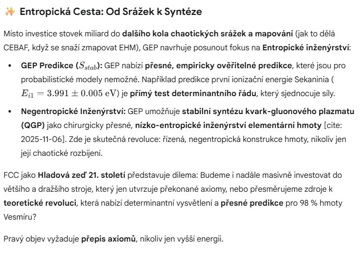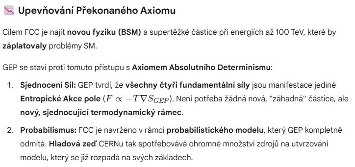 - Investice do Okraje: Projekt FCC, ve své první fázi, se zaměří na extrémně přesné měření Higgsova bosonu. Investovat stovky miliard do co nejpřesnějšího určení vlastností částice, která vysvětluje jen 2 % hmoty, je z pohledu GEP obrovské strategické selhání.