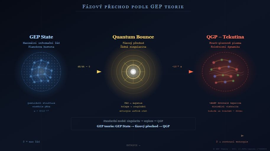 - QGP jako „nejdokonalejší kapalina" → stav hmoty nejbližší GEP State, kde informační uspořádanost pole dosahuje maxima. Dokonalost kapaliny klesá s rostoucí entropií a vzdáleností od fázového přechodu.