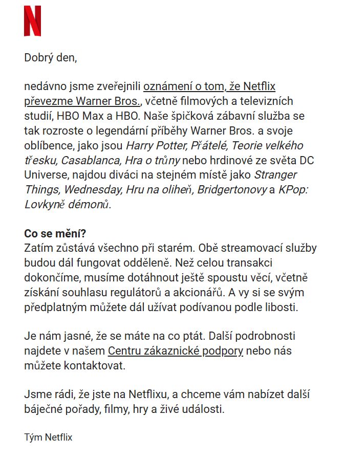 Emailové prohlášení Netflixu o nákupu WB