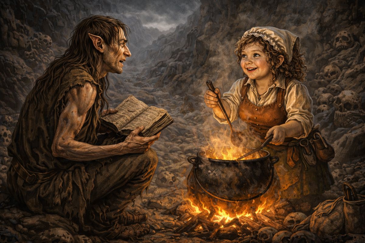 Nikdy jsem se neptal, odkud to všechno ví. Hobiti mají své způsoby. Jsou malí a tiší a velcí tvorové před nimi mluví, jako by tam nebyli. Rosie vaří vedle Ograllin každý den. Prý skoro třicet let. Třicet let poslouchání, třicet let sbírání střípků, které matrona občas odhodí ke zvědavým uším. Ograllin mluví k ohňům v kotli. K Velké tlamě. K sobě samé. A k mumii. Ale to je jiný příběh.