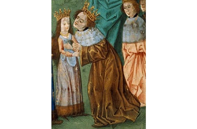 „Slzící princezna Isabella, oblečená v modrých sametových šatech zdobených zlatými liliemi a s korunkou ze zlata a perel, byla nesena vévody z Berry a Burgundska do Richardova pavilonu,“ popisuje kronika svatební obřad z 4. listopadu 1396.