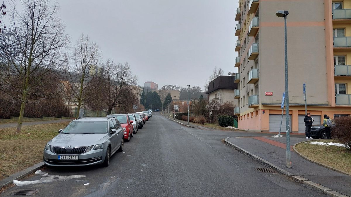 Začátek ulice Skaláků, učiliště je vlevo za chodníkem. Na horizontu jsou vidět první paneláky sídliště Novodvorská