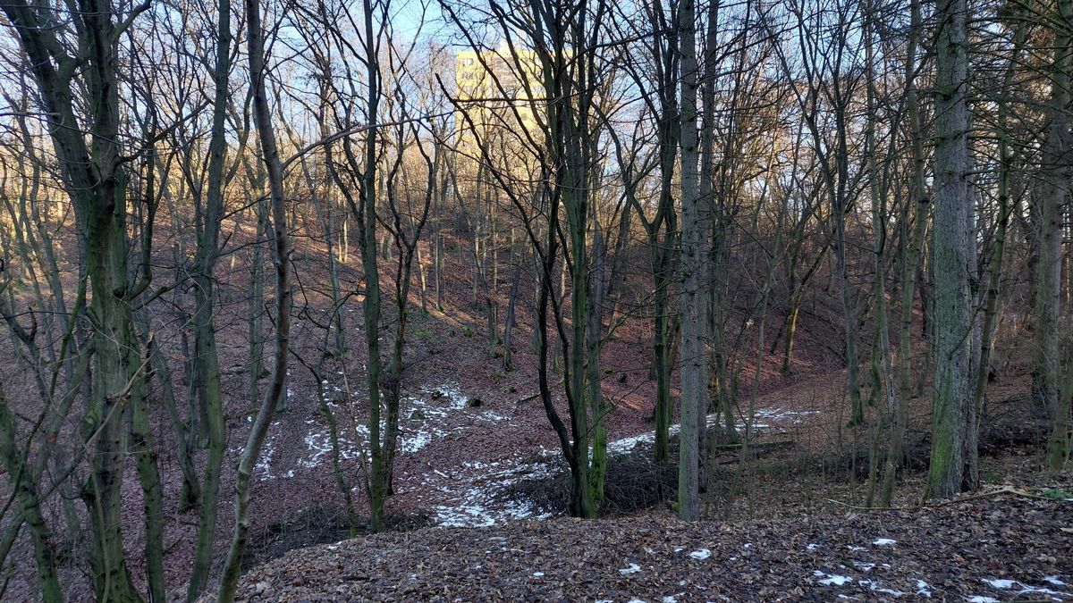 Novodvorská rokle. Za stromy jsou vidět první domy sídliště.