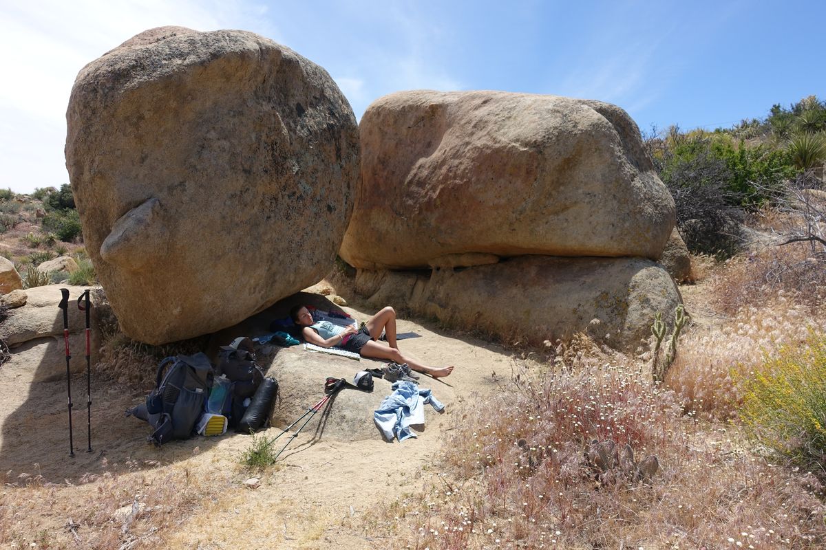 Odpoledne je opět ve znamení kopců a šíleného vedra. Přicházíme ke zdroji vody, o který se stará trail angel Mary. Nechává u sebe na pozemku přespávat hikery, je tady dokonce knihovna, velký tank vody a…sprcha z kýblu. Nikdy bych nevěřila, kolik radosti mi přinese ledová voda, kterou se ze zavěšeného kyblíku polévám. Konečně se po třech dnech aspoň na chvíli necítím jako úplná šmudla. Nabíráme dalších šest litrů vody a pokračujeme o pár set metrů dál.