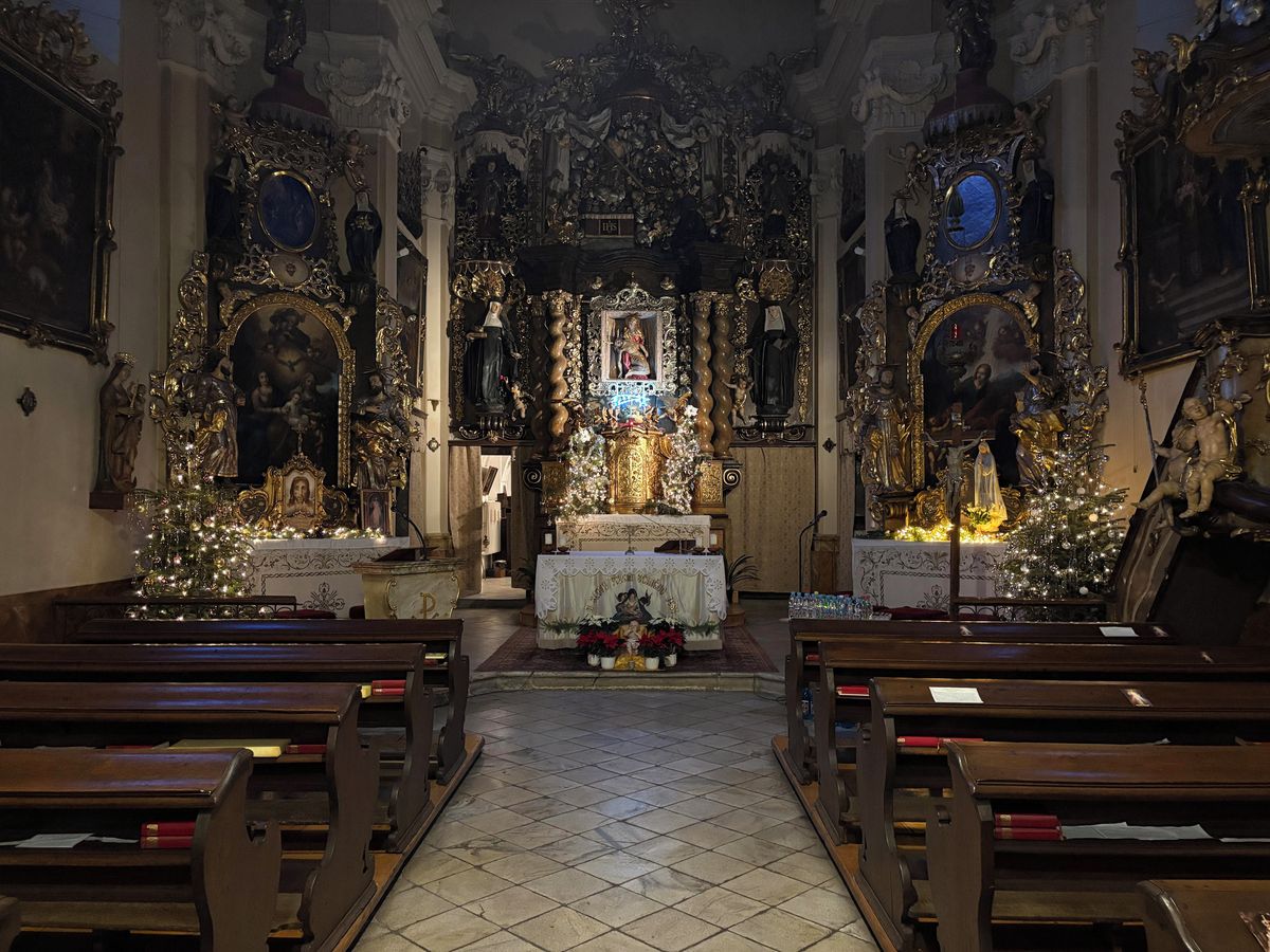 Interiér kostela je barokně opulentní. Zdobené oltáře a kazatelna, štuk, plastiky, velmi bohaté řezby, profilované římsy, varhanní kruchta… Tři oltáře koncipoval Dientzenhofer, avšak některé ze soch zřejmě pocházejí ze zrušené mariánské kaple nebo z nedalekého kláštera servitů. Hlavní oltář zcela zaplňuje západní stěnu kostela. Původní obraz Piety od Siarda Noseckého (barokní malíř, viz dále) byl nahrazen dřevořezbou z počátku 18. stol. Po stranách dvě sochy řádových světic sv. Alžběty Durynské a blahoslavené Angeliny. V oltářním nástavci řezbář zpodobnil sv. Františka z Asisi, jak přijímá od Krista a P. Marie odpustky. Ještě bychom zde měli najít sv. Petra a kající se Máří Magdalénu, dále sochy sv. Jana Nepomuckého a sv. Karla Boromejského. Na vrcholu oltářní stavby pak na vše shlížejí archandělé Michael, Rafael a Gabriel.