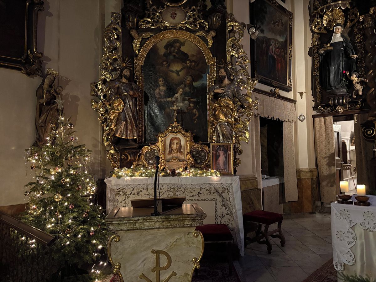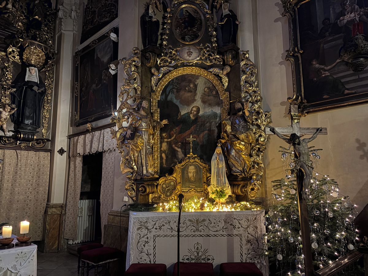 Boční oltáře jsou dva. Jižní je zasvěcen sv. Janu Evangelistovi a severní sv. Anně. Obrazy zřejmě pocházejí od Siarda Noseckého (1693 - 1753). Narodil se na Starém Městě, vyučil se malířem u svého otce Václava Jindřicha a v r. 1724 vstoupil ke strahovským premonstrátům. Zde přijal méně obvyklé řádové jméno Siard (premonstrátský světec, +1230). Na Strahově vymaloval mimo jiné teologický (menší) sál tamní knihovny.