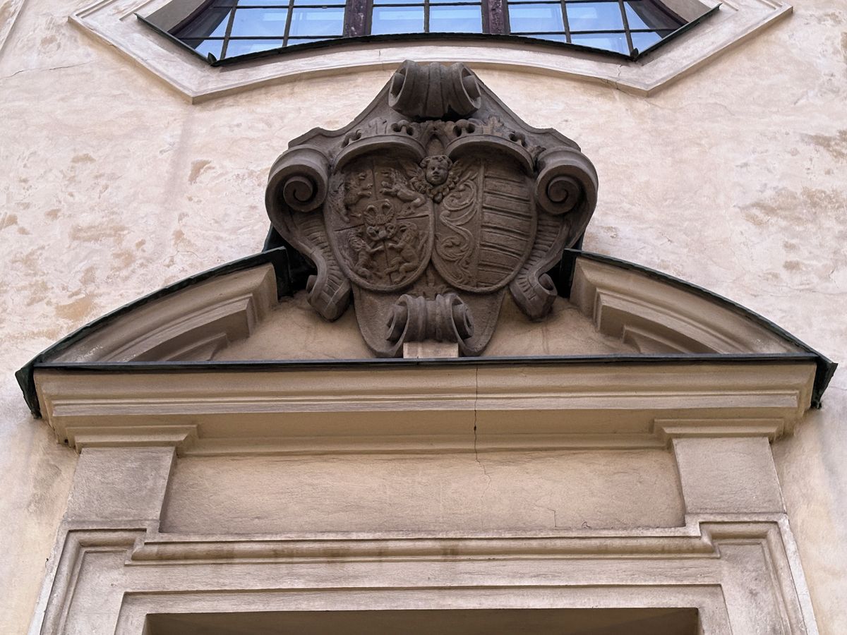 Valdštejnsko-černínský alianční znak nad vchodem do kostela.