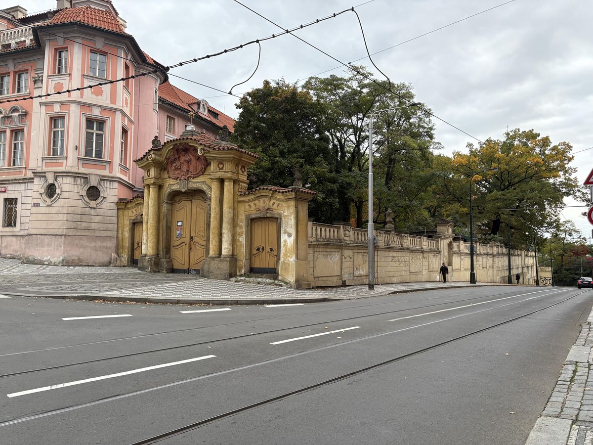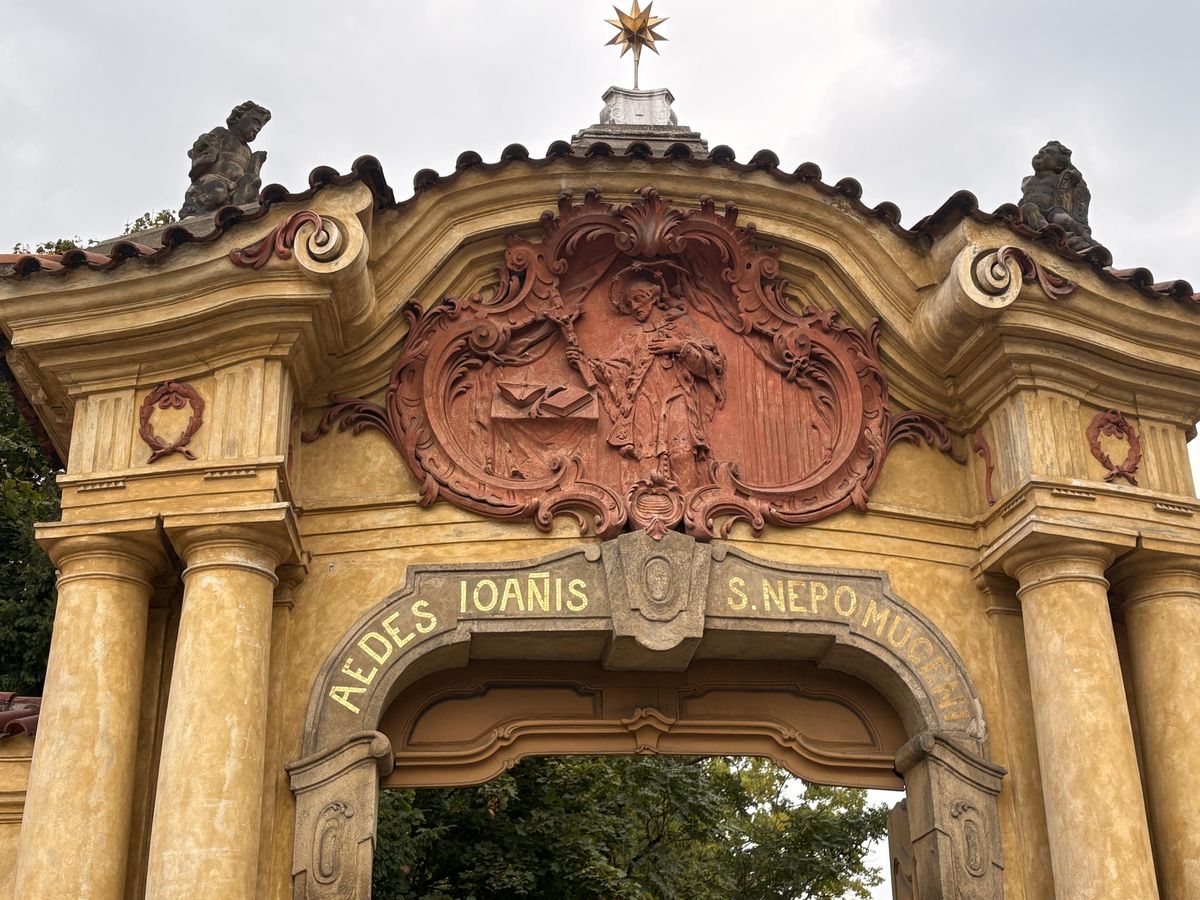 Novobarokní branka k hotelu se svatojánským reliéfem