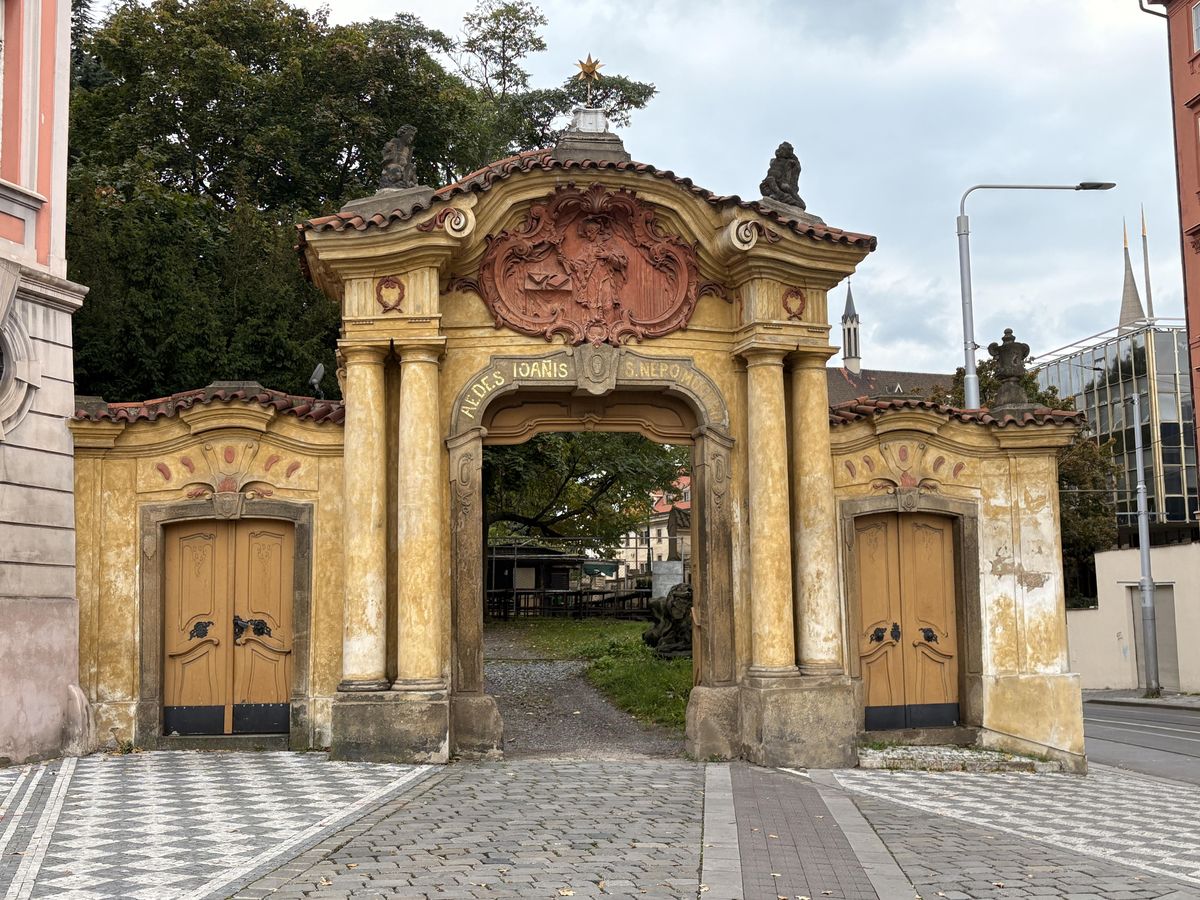 Brána do zahrady, zahrada a západní zeď. K nárožní vížce přiléhá jedna z nejkrásnějších rokokových bran v Praze. Vede do úzké zahrady, ve které se ještě dnes pořádají výstavy skalniček a která je z jedné strany lemována boční fasádou Faustova domu a z druhé strany ji od Vyšehradské ulice odděluje vysoká zeď s balustrádou se zbytky sochařské výzdoby. Vstupní brána je triumfální oblouk v barokním pojetí. Jeden hlavní, vyšší vstup, dva nižší po stranách. Prolamované, zvlněné římsy jsou ukončeny prejzovými stříškami se soškami sedících andílků, přičemž ústřední brána je korunována zlatou, zřejmě svatojánskou, hvězdou. Opomenout nelze reliéf nad hlavním vstupem znázorňující sv. Jana s krucifixem v pravé ruce. Samotná brána je lemována dvěma dvojicemi sloupů a v kartuši je zlacený nápis „AEDES IOANIS S.NEPOMUCENI čili svatyně (kostel) sv. Jana Nepomuckého. Když jsem se AI zeptal, proč je „aedes“ také komár, dozvěděl jsem se, že řecky „ἀηδής“ (čti „aédés“) je otravný, nepříjemný. Kdežto latinské „aedes“ (čti „édes“) je chrám. K pobavení: Ve Fausťáku pracovala mamka coby důchodkyně na právním oddělení nemocnice. Poslal jsem jí pohled z dovolené, kde jsem uvedl FN s polyklinikou…“. Máti se zděsila. „Vždycky s měkkým „i“!“ Odvětil jsem, že tam léčí skoro vše, tak by mělo být „y“ tvrdé. Třeba jako polyfunkční, polymer… Chyba lávky. Na poliklinice sice léčí hodně nemocí, avšak původně šlo o městskou, obecní nemocnici. A obec je řecky „polis“. Každopádně je brána natolik pozoruhodná, že budějovická firma Plus Model s.r.o. má ve své nabídce její model, který si lze sestavit. A kdo ji navrhl? Zřejmě Antonín Schmidt (1723 - 1783), nikoli nevýznamný architekt pozdního baroka. Ve starší literatuře se brána přisuzovala přímo Kiliánu Ignáci Dientzenhoferovi.