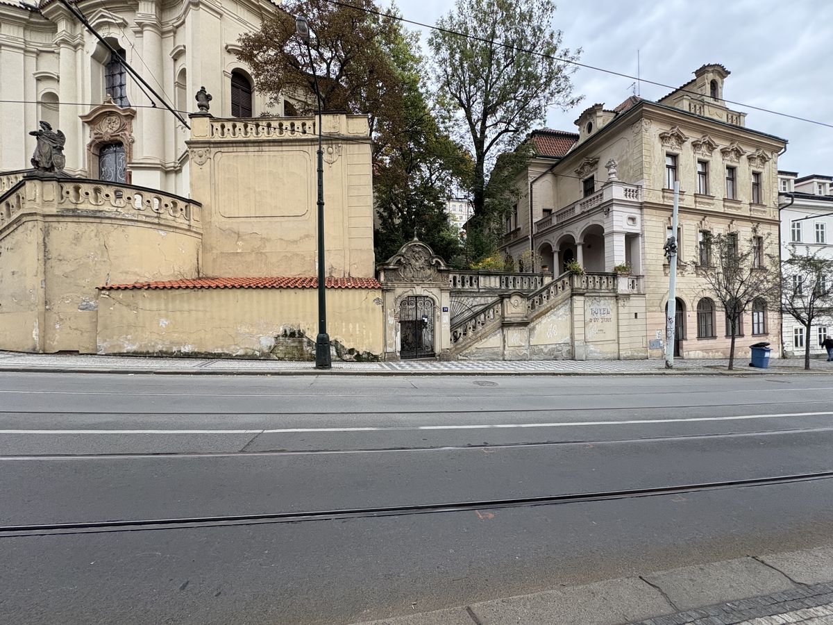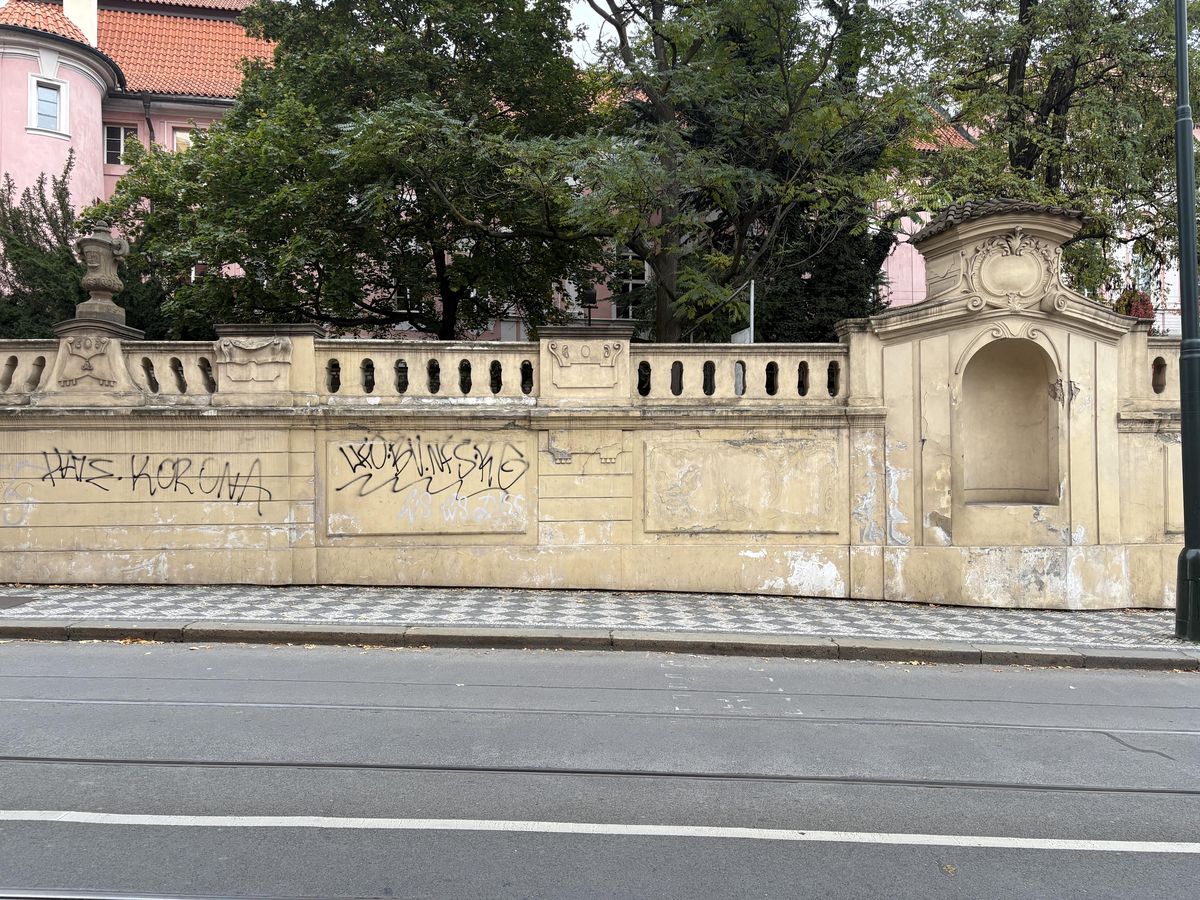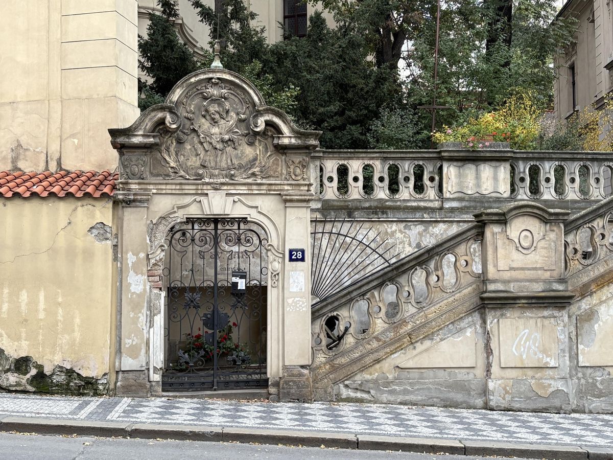 Vysoká zeď oddělující zahradu od Vyšehradské ulice je zdobená výklenky (nikami) a balustrádou se zbytky barokní sochařské výzdoby (vázy, sochy). Končí mohutným dvouramenným schodištěm, po kterém lze, je-li otevřena tepaná branka, vystoupat k hlavnímu západnímu vstupu do svatojánského kostela. Schodiště se však většinou neužívá a na nedělní mši lidé přicházejí z Karlova náměstí již zmíněnou branou, zahradou a bočním, severním vstupem do kostela. Schodiště zdobí vázy a dvě sochy andělů. Architektem zdi, schodiště a úprav západního křídla Faustova domu byl pravděpodobně již zmíněný Antonín Schmidt. Mladotové - možná kvůli zálibám alchymistickým - uvítali každý groš, a tak od nich západní křídlo paláce odkoupila arcibiskupská konzistoř. Potřebovala obydlí pro administrátora nového kostela. S tím souvisely i Schmidtovy úpravy.