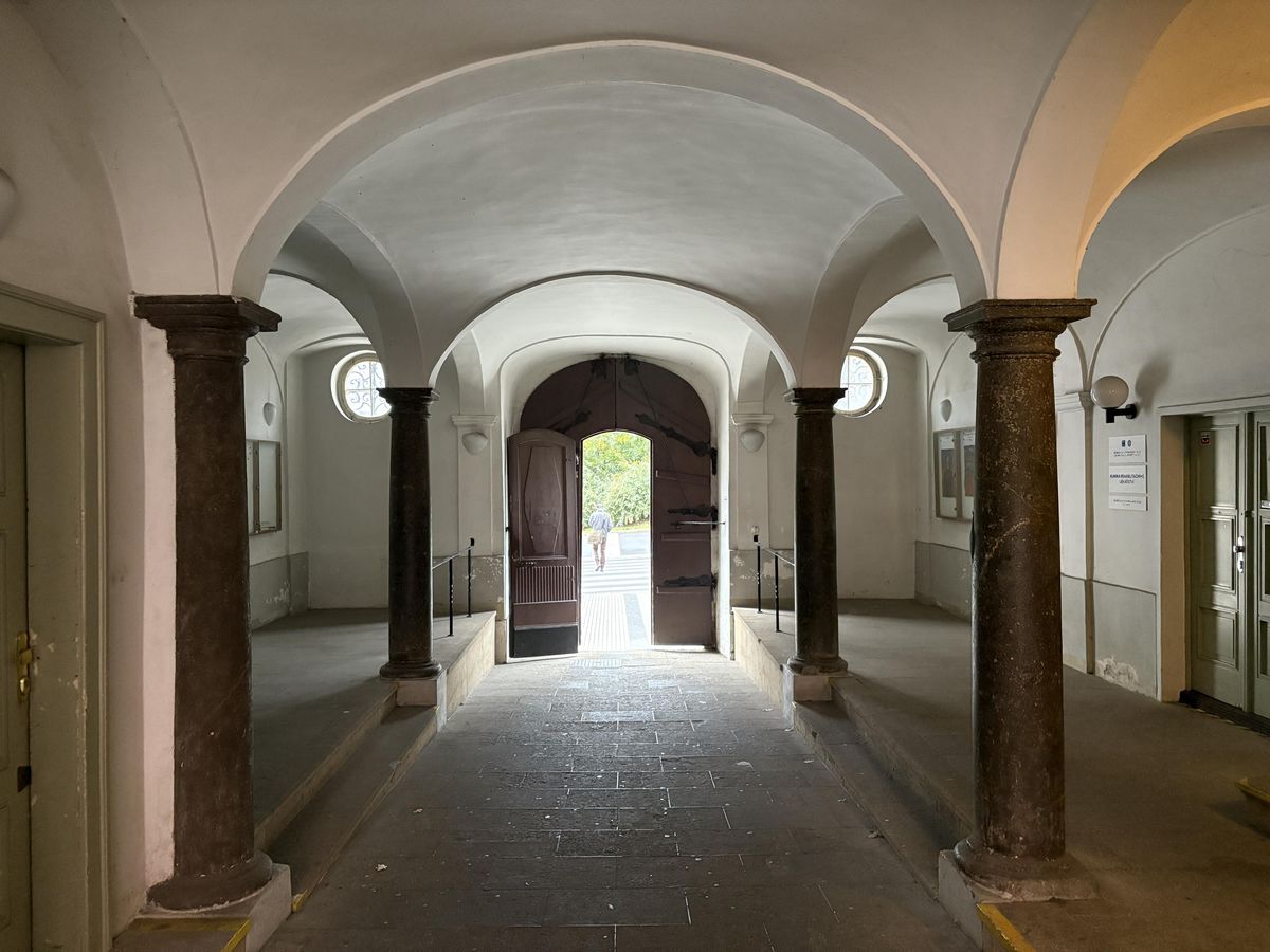 Severní průčelí projmuté dovnitř s vchodem do kostela