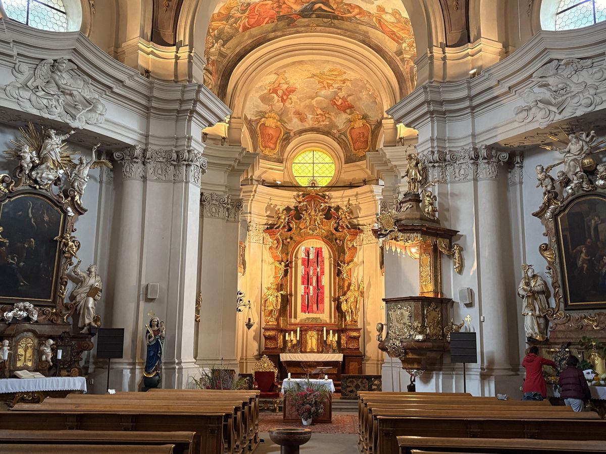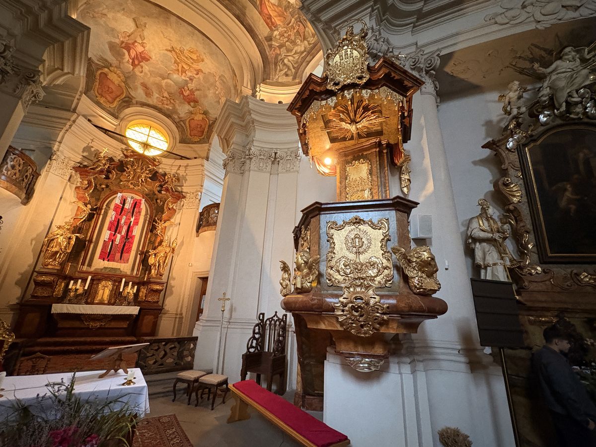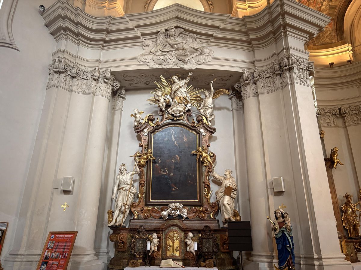 Úchvatný je vnitřek. Ústřední osmiúhelný prostor je zaklenut českou plackou. Jinak doporučuji prohlédnout si fotky, neboť popsat architekturu interiéru na nad moje síly. Pro auditora účetních závěrek, jímž jsem, je důležité ocenění stavby, doba, po kterou se odepisuje, správné rozlišení mezi opravou a technickým zhodnocením, vlastník, výnosy z nájemného a ze vstupného… Stačí tedy výrazy, jako symetrie, pilastry s iónskými hlavicemi, čtyři edikuly (vnitřní „kaple“ pro oltáře a zpovědnice) propojené oblouky, bohatě profilované římsy, štuk, velká okna a světlo. Pohyb, pohyb a zase pohyb.